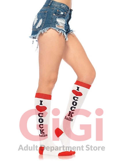 Knee high socks that read " I (heart) Cocktails." Red, black, and white. One size fits most 90-160 lbs. Hanger packaging.