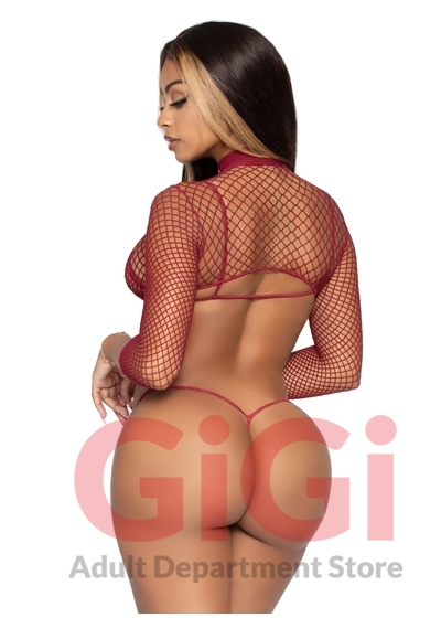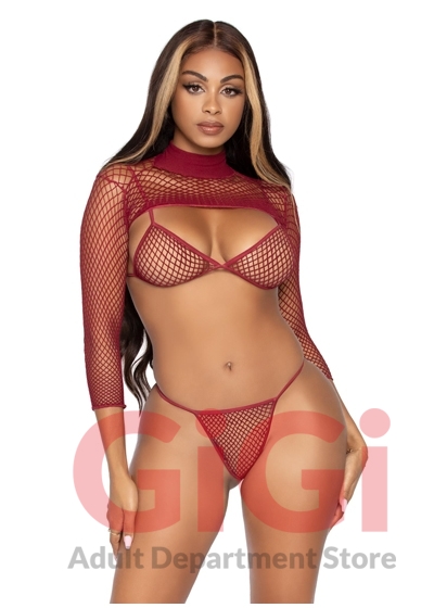 3 Pc Industrial Net Bikini Top G-String and Long Sleeved Crop Top Burgundy OS