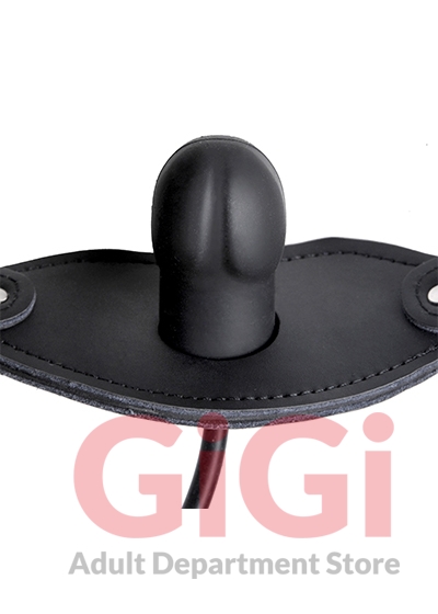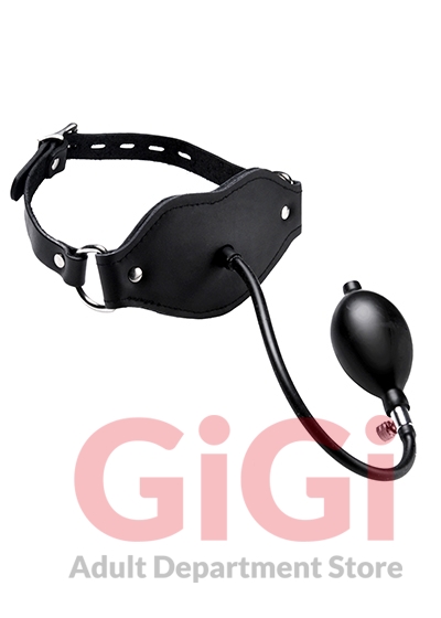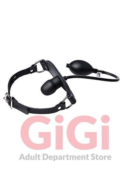 This inflatable dildo gag is sure to keep your plaything in pleasured silence with its expandable penis head shaped gag, and comfortable leather head straps. The gag is inflated by means of a pressure bulb, easily pumped by hand. To deflate, just turn the pressure dial for a quick release. This devious piece is is held in place by adjustable leather straps, secured by a buckle that accepts any small standard lock if you wish to secure them further. The gag itself is made of odorless, tasteless, phthalate-free silicone.