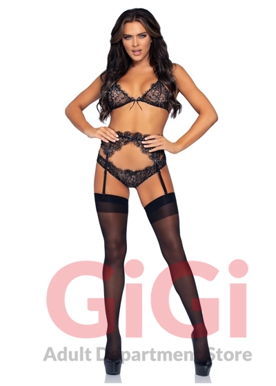 Step up your romance game in the rhinestone lingerie set by Leg Avenue. Featuring beautiful floral lace fabric and shimmery rhinestones, this 3 PC bra and panty set is sure to set the mood. The complete look includes an eyelash lace rhinestone bra top, full back panty, and matching scalloped lace garter belt. Complete your look with Leg Avenue thigh-high stockings.