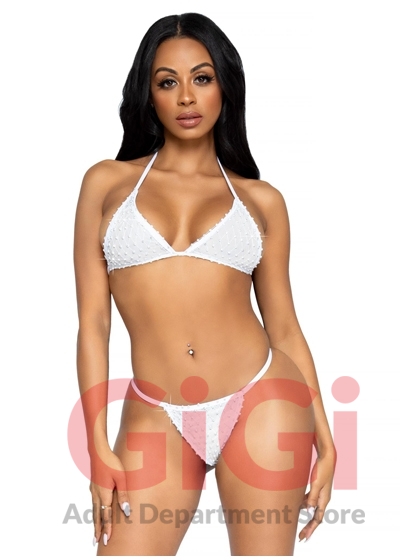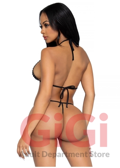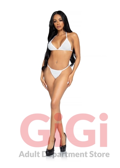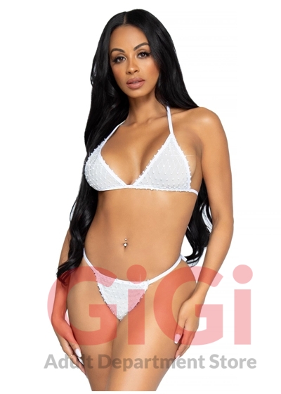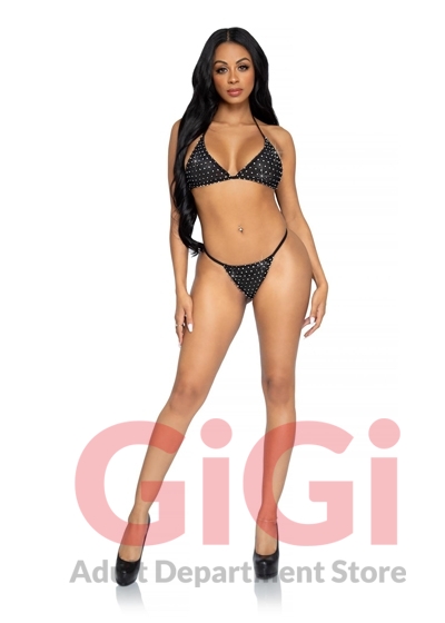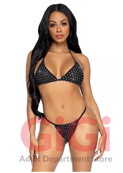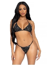 Give them something to talk about in this stunning 2 PC lingerie set by Leg Avenue. The versatile sexy lingerie look features an enticing mesh bikini top with rhinestone fishnet overlay and naughty g-string bottoms. This hot lingerie set is perfect for the bedroom, as a daring beach bikini, or use the bikini top as a naughty night out look.