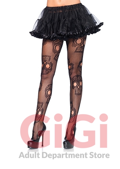 Fishnet pantyhose with sugar skull details. One size fits most 90-160 lbs. Hanger packaging.