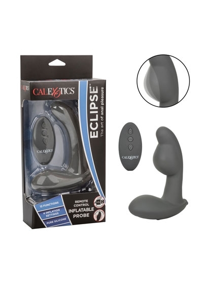 The Eclipse Remote Control Inflatable Probe is a sensual silicone probe created to increase your thrilling sensations at the touch of a button. The premium silicone anal probe has a unique inflatable shaft, 12 functions of vibration, and a playful remote control. Tease and tantalize with the 4 unique inflation settings that make the shaft gently swells in size to redefine pleasure. Deliver deep rumbling sensations with the 12 independently controlled functions of vibration. The sleek, yet discreet controller makes it easy for you or your lover to control vibration intensity with the touch of a button. Whenever or wherever passion takes you, this passionate vibrators 32.5-foot radius range and 12 intense functions of vibration are ready for playtime. Enjoy comfortable insertion, effortless stimulation and gentle removal with the gentle ergonomic shape, flexible design and curved base. Recharge the premium silicone massager in 2 hours with the provided USB charging cable to enjoy 50 minutes of high-speed stimulation or 180 minutes of low speed vibrations. While the easy button controls the intensity and the plump probe gives you the stimulation you want, the integrated state of the art memory chip remembers just how you like it by starting on the last function used.