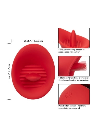 The sensual French Kiss Seducer is ready to slip into your purse or overnight bag for orgasmic pleasure on-the-go. The compact massager is sure to deliver powerful flickering pleasure with 12 sensual functions of fluttering vibrations through the tongue-like tip. The full contact scoop and fluttering tongue teaser has been crafted to perfectly contour to your most intimate pleasure points. The soft supple silicone and sensually contoured body let you deliver pinpoint pure pleasure form almost angle. Use the easy-touch button to control up to 70 minutes of vibrating pleasure. Recharge up your pleasure in only 1.5 hour with the provided USB cable into the self-healing charging port on the massager. The mini massagers discreet size and travel-lock button makes it the perfect travel companion, letting you embrace radiating pleasure wherever your fantasies take you.
