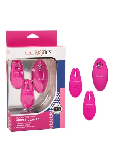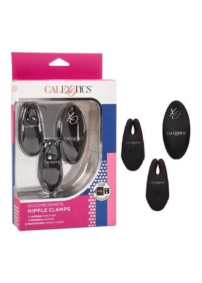 Blur the borders between pleasure and pain even further with the game-changing Silicone Remote Nipple Clamps. This daring designer nipple clamp set features 12 independently controlled functions of vibration, remote control and USB rechargeable battery.