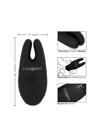 Clamp these multi-use teasers to your body and enjoy every rush of stimulation as you flicker through the powerful functions of vibration as the touch of the remote. As the tension tightens, the tingles intensify with every touch of the button for the ultimate in nipple stimulation toys. The discreet mini remote control makes it easy to enjoy adventurous foreplay. Once fully charged, the versatile teasers have an orgasmic controller range of up to 32.75 ft (10 m) away!