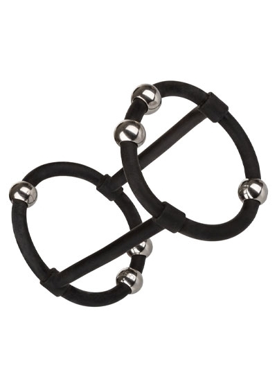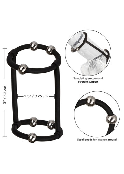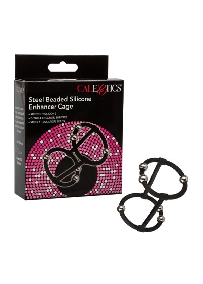 Made to enhance, escalate and intensify ecstasy every time you slip on the Steel Beaded Silicone Enhancer Cage. The sturdy, yet stretchy silicone dual enhancer cage supports, while the moveable steel pleasure beads thrill you and your lover. The ultra-stretchy dual erection support ring is sure to enhance pleasure by increasing stamina, sensitivity and girth. Look forward to an explosive pleasure experience with every teasing stroke of the steel pleasure beads with adjustable and moveable placement. This strong, supportive ring cage indulges your man with increased stamina, girth and sensitivity, while you can savor his increase stamina and girth, the thrilling stimulation beads tease you towards an orgasmic wonderland. The passionate pleasure ring is made of silicone and stainless steel pleasure beads. The diameter of each ring is 1.5 (3.75 cm) with and overall size of 3 x 2 (7.5 cm x 5 cm)