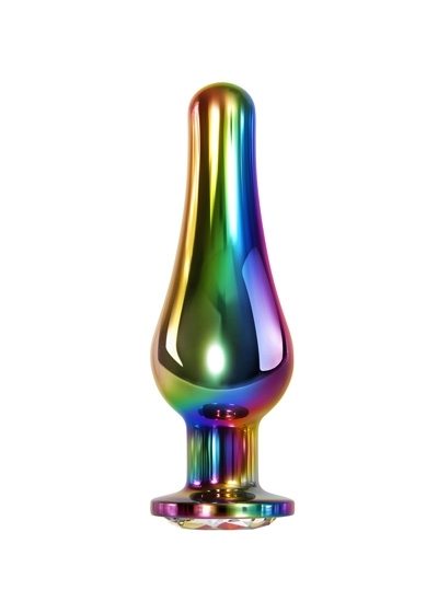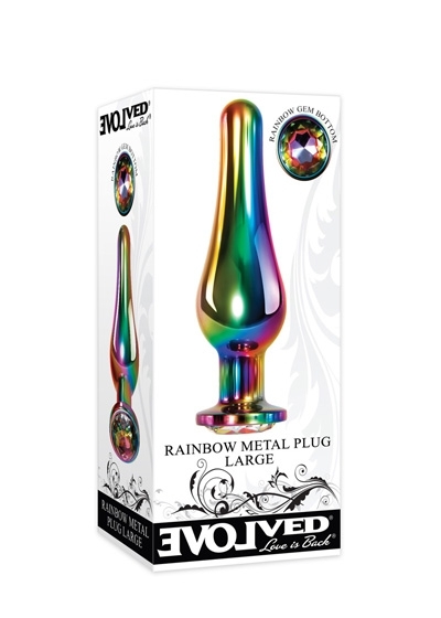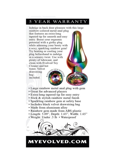 Indulge in back door pleasure with this large rainbow-colored metal anal plug that features an extra-long tapered tip for smooth and easy entry. Boost your orgasmic potential with a girthy plug while adorning your booty with a sexy, sparkling rainbow gem! Try heating or cooling your plug beforehand to indulge in a sensory twist. Use with plenty of lubricant, and clean with Evolved Toy Cleaner and hot water. Velvet drawstring bag included.
