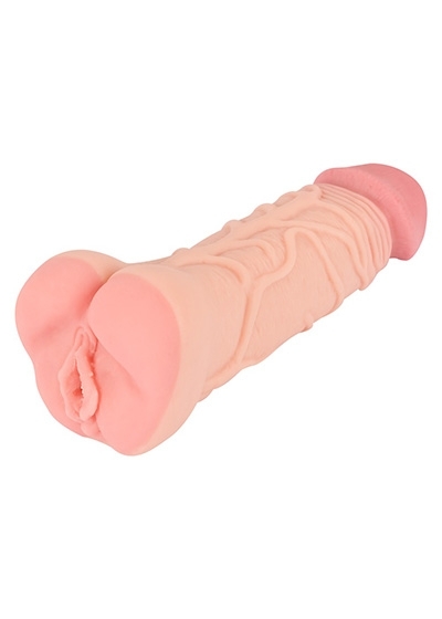 Masturbator in a vagina design with a pleasure canal in a penis design – made out of skin-like Nature Skin material. The pleasure canal has pronounced veins and bulging glans. The pronounced, stimulating texture inside the pleasure canal provides an intense and orgasmic massage experience when the penis gets inserted. The soft material means that the pressure can easily be adjusted – it just has to be squeezed. The masturbator can also be used as a penis sleeve for extending and thickening the penis.