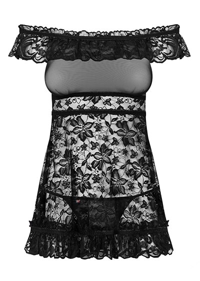 Transparent babydoll with lace in the cleavage area and on the hem and a seductively open front. A matching string is included. Black. 94% polyamide, 6% spandex.