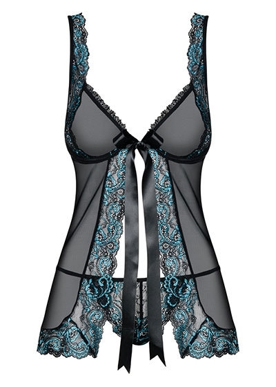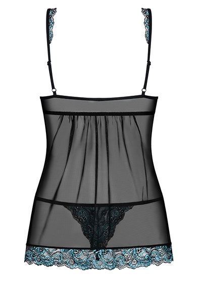 This transparent babydoll with lace, a Carmen neckline and slightly flared hem will make hearts race. A string is included.