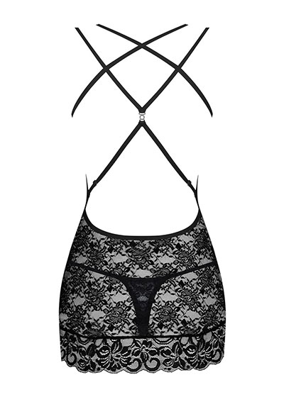 Mini dress with a seductive, almost completely open back for exciting and sensual moments. The 4 criss-cross straps and the rhinestone at the back show that a lovely back can also attract. The cleavage also has an eye-catching design with a decorative rhinestone and a strap that emphasises the breasts. All straps are adjustable, the string is included.
