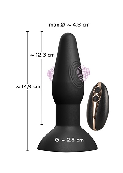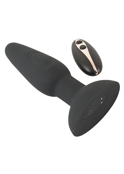 Vibro-butt plug with an innovative thumping function in the middle of the plug. The 7 vibration modes and 3 pulsating, thumping modes can be controlled separately using the button on the remote control. The plug can also be controlled by a partner because it has a range of up to 10 metres – making surprising moments and exciting control games possible. It has a soft touch texture which feels great against the skin during wear and play. The wide base means that it can be guided easily and stops it for sliding in too far. It can also be worn over a long period of time. It can also be enjoyed in the bath or the shower because it is waterproof. It can be recharged with the included USB cable. Includes a battery (CR2032) for the remote control.
