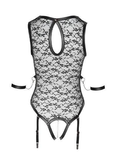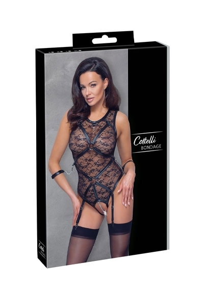 Body with suspender straps from Cottelli BONDAGE that is made out of delicate, soft lace. The body also has exciting matte look details. There is a harness at the front that is made out of soft matte look straps and rings. There is a ring at either side of the body (in the waist area) where the included soft arm restraints can be attached. The restraints can be easily attached to the rings because of their snap hooks. The crotch area is completely crotchless and there is only a (removable) stimulating chain over the crotch. There is a small ring on the neckline and there is a press stud at the back. The restraints can be adjusted with the hook and loop fasteners. The adjustable suspender straps are removable.