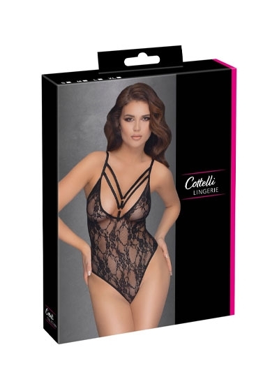 Lace body with an extremely seductive low-cut cleavage area. There are also stretchy straps in the cleavage area that are connected by gold-coloured rings. The straps can be adjusted for a perfect fit.