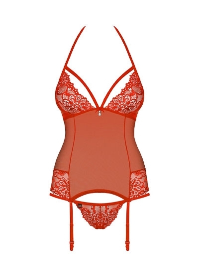 This basque with a halterneck and lace inserts puts the seductive female curves in the limelight in a very effective way. The bra and suspender straps are adjustable. A matching string is included.
