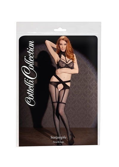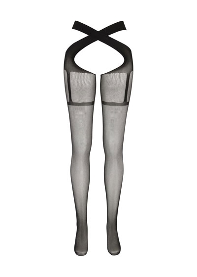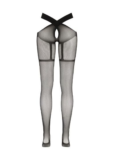 Net stockings with suspender straps and garters woven into them. The suspender belt is worn around the waist in a criss-cross style and this makes it an exciting eye-catcher.