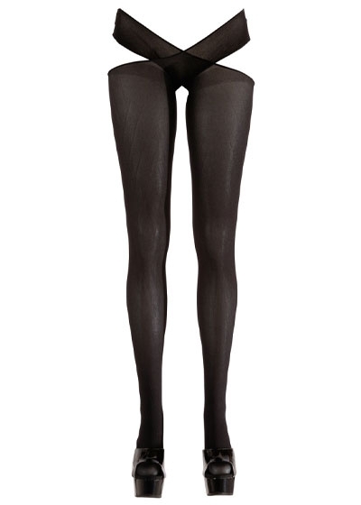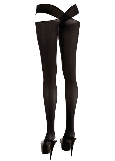 Black stockings with a waist strap that is worn in a criss-cross style. Crotchless.