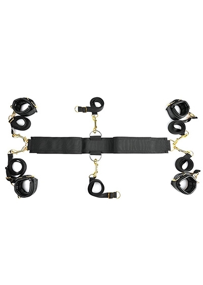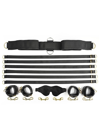 A strong nylon anchor connector strap slides under your mattress to secure six adjustable restraint straps. Four straps end in high-quality faux leather wrist and ankle cuffs with golden hardware while two are crafted with loops that promise leverage of all kinds. Position the straps around your mattress just the way you like them, tie your lover down tight, and slip the soft velvet blindfold over their eyes for a session full of surprises.