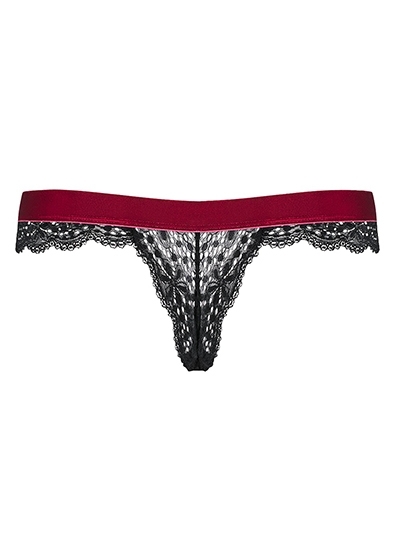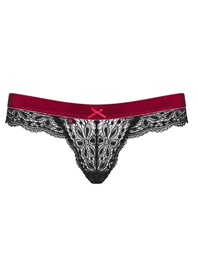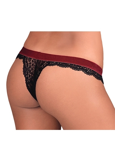 String made out of soft, stretchy, black lace. It has a velvet, burgundy coloured waistband. There is also a small decorative bow on the waistband as well.