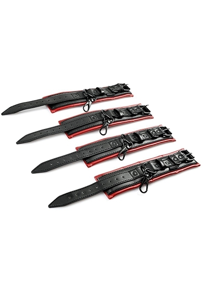 Four faux leather, lightly padded adjustable cuffs in the signature red and black of the Saffron collection buckle comfortably around your wrists and ankles and clip to the spreader bar and each other in any way you can dream up. The strong, solid spreader bar?s rings are firmly welded in place, so there?s no escape...only release.