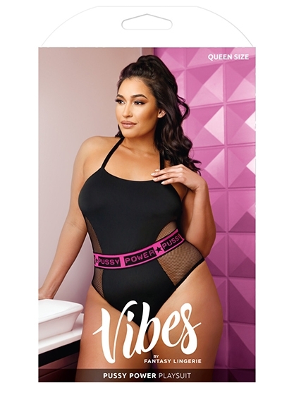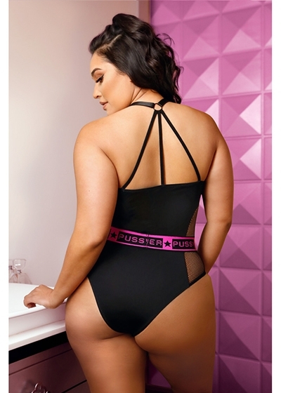 Cheeky Microfiber & Fishnet Playsuit with "Pussy Power" Elastic Waistband