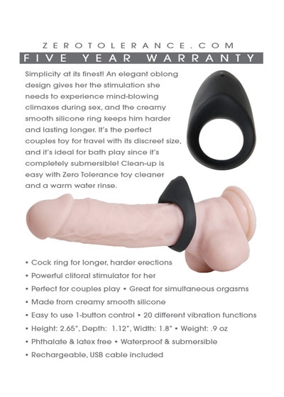 Night Rider Cock Ring from Zero Tolerance Toys. Great for couples play. Encourages harder, longer lasting erections. Simplicity at its finest! Set the mood with this illuminated cock ring that adds ambiance to any sexual encounter! Powerful vibrations with 7 unique speeds and functions stimulate both lovers with gentle or intense sensations, and the elegant, chic design fits most comfortably.