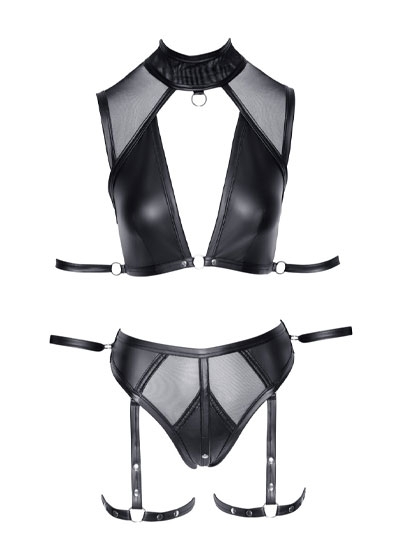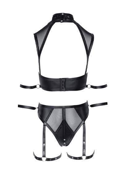 Top and briefs from Cottelli BONDAGE made out of beautiful matte look material with transparent Powernet inserts. Very low cut top with a high-neck collar that has a decorative ring at the front and 2 press studs at the back to fasten it. It is almost backless but there is a wide strip of material with a hook fastener. There is a ring at either side with restraints for the arms. The briefs are waist high and have press studs in the crotch area for erotic moments of pleasure. There is a ring at either side (in the waist area) with restraints for the hands. The thigh straps can be removed. The restraints for the arms and hands have hook and loop fasteners and can also be removed.