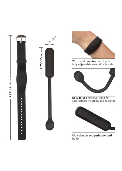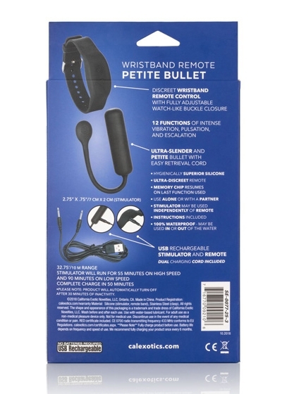 The Wristband Remote Petite Bullet is a powerfully mini vibrator paired with a playfully discreet wristband controller for adventurous pleasure seekers. The stylish, yet discreet wristband controller makes it easy for you or your lover to control vibration intensity with the touch of a button. Whenever or wherever passion takes you, this passionate panty vibrator’s 32.5-foot radius range and 12 intense functions of vibration are ready for playtime.