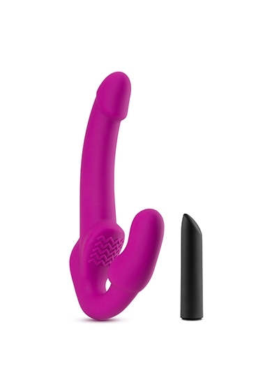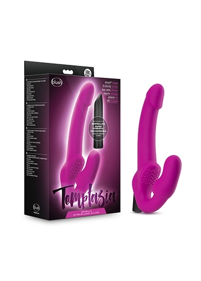 The Temptasia Estella Strapless Dildo with Vibrating Bullet brings pleasure for everyone! Get more stimulation from its: (1) pronounced head for G spot or prostate play, (2) ergonomic bulb for vaginal sensation, and (3) sloped pleasure ridge for clitoral pressure. Insert the best-selling Exposed 10-function bullet vibe into Temptasia Estella and enjoy its deep, rumbly vibrations along with your partner. The waterproof, rechargeable bullet vibe can also be used outside the dildo. Its slanted tip is ideal for intense focused stimulation. Made of smooth UltraSilk silicone, Estella is body safe and easy to clean.