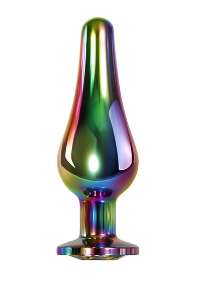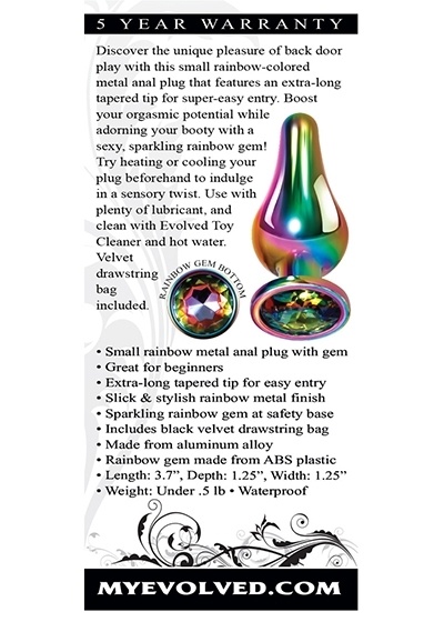 Discover the unique pleasure of back door play with this small rainbow-colored metal anal plug that features an extra-long tapered tip for super-easy entry. Boost your orgasmic potential while adorning your booty with a sexy, sparkling rainbow gem! Try heating or cooling your plug beforehand to indulge in a sensory twist. Use with plenty of lubricant, and clean with Evolved Toy Cleaner and hot water. Velvet drawstring bag included.