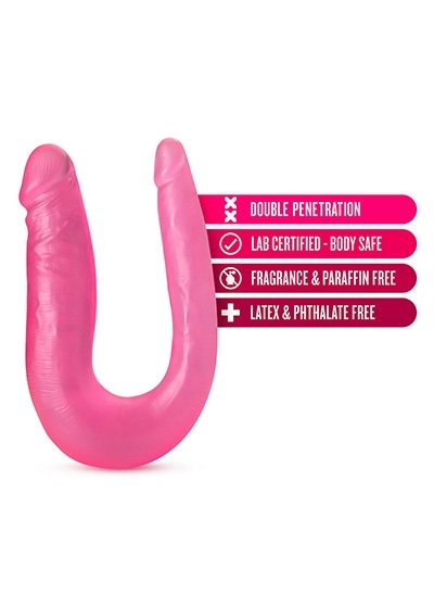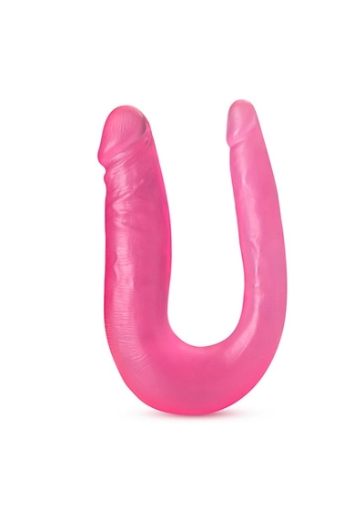 B Yours is ready to please! The B Yours Sweet Double Dildo is ready to aid you in exploring creative possibilities. This soft, U-shaped toy flexes and curves, making it ideal for double penetration or for comfortable use between partners. Grip its U-shape curve and move both heads for blended pleasure! Featuring 2 different-sized ends for comfort: slim on one side, and average girth on the other. Made of our lab-tested non-porous PVC, the Sweet Double Dildo is body safe, phthalate-free, fragrance free and easy to clean.