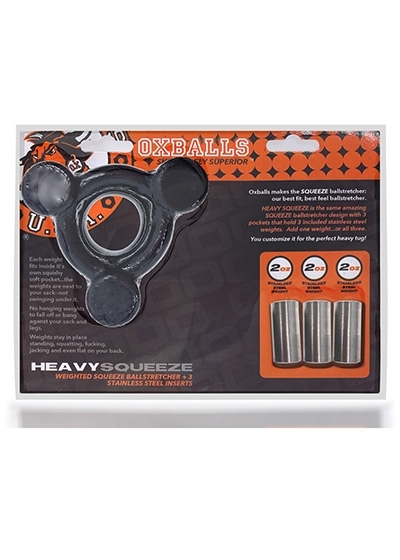 HEAVY SQUEEZE weighted ballstretcher hangs weights on your ballbag, puts three weights directly on your sack in rubbery holders attached to our best original SQUEEZE ballstretcher. HEAVY SQUEEZE comes with 3 stainless-steel weights you can add separately for added weight, less when you want, more when you NEED!