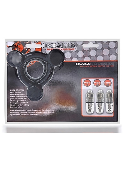 BUZZ SQUEEZE triple-vibe ballstretcher is OXBALLS top-dog SQUEEZE ballstretcher, the most popular, the best fit and feel ballstretcher we offer with three vibes right on your sack…three vibes SQUEEZE holds directly on your nutbag.