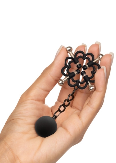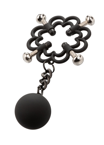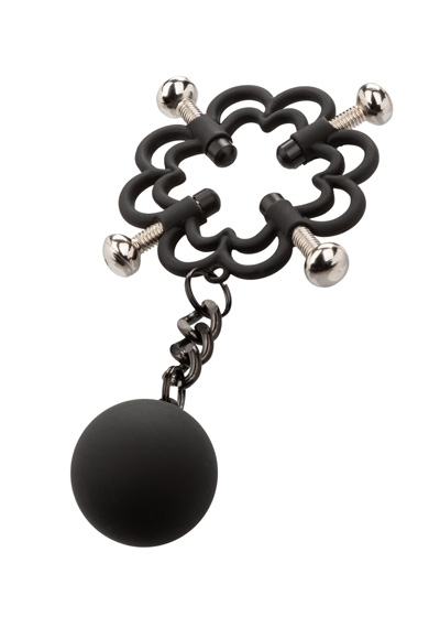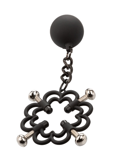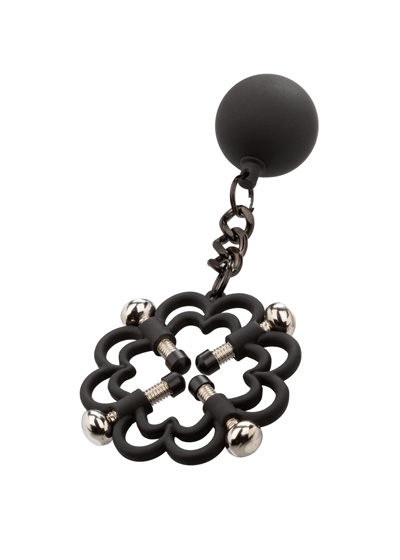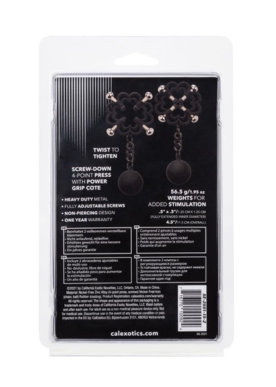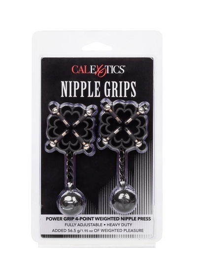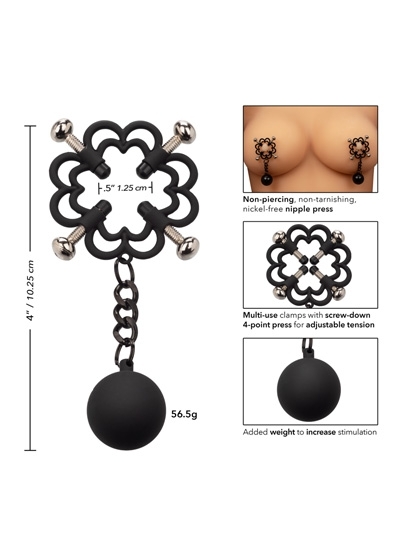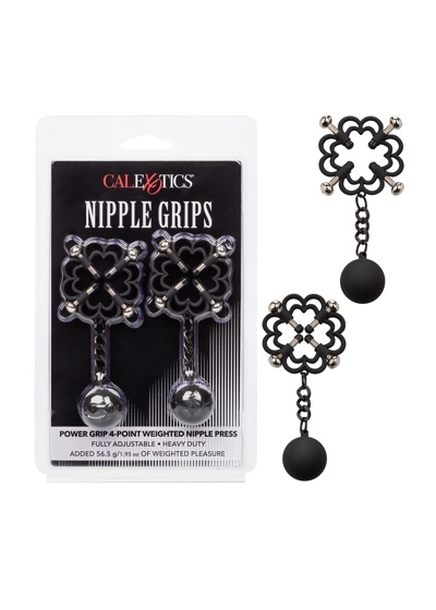 Power Grip 4-Point Weighted Nipple Press. Explore elevated sensation with the 2 fully adjustable multi use clamps, screw down 4-point press, and teasing weights. Reach new levels of playful pleasure in the screw-down 4-point press with fully adjustable screws covered in a power grip Silicone-cote. Clamp the naughty clasps to the nipple or anywhere on the body and enjoy every rush of pain and pleasure with every tug or swing of the weights. The teasing clamp has fully adjustable 4 points of tension to stimulate anywhere on your body for playful teasing. As the tension tightens, the tingles intensify with every turn of the screw for the ultimate in nipple stimulation toys. These easy-to-use nipple teasers are great for him, her, or them.