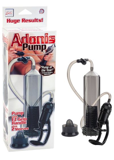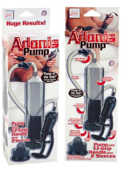 Build yourself an impressive erection with the EZ Grip Adonis, it's a complete classic, consisting of a firm, transparent measured cylinder and unique pump trigger handle connected to a length of flexible hose. A soft, removable silicone donut sleeve surrounds the entry for a comfortable, airtight fit that feels fantastic, contributing to arousal and the lengthening, firming effects of the pump. A second sleeve is also included, made from soft, temperature sensitive PVC, it's intensely textured and reaches about halfway up the length of the cylinder, providing superior stimulation as you pump. A unique, high performance trigger handle fits easily and comfortably in hand, allowing for maximum control- a quick release valve just above the handle instantly releases pressure when you're done, or need a break. Use a good water based lube if needed with the Adonis, avoid silicone lubricants if using the silicone donut.