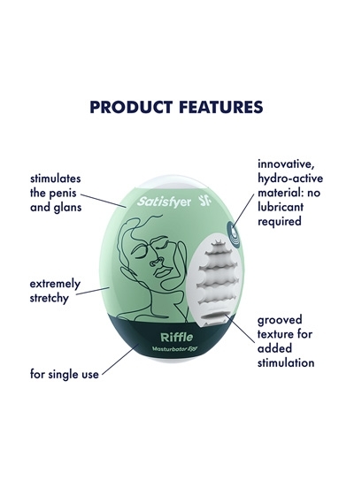 You’re always on the safe side with the Satisfyer Riffle Masturbator Egg. The masturbation device is intended for single use: The design is egg-shaped, discreet and ideal for a quick fix on the go. The eggs are made from innovative, flexible, hydroactive TPE, which can be moistened with a small amount of water or saliva, ensuring smooth pleasure with a smooth feel. Pleasure on the go has never been so easy - thanks to the innovative material, no additional lubricant is necessary