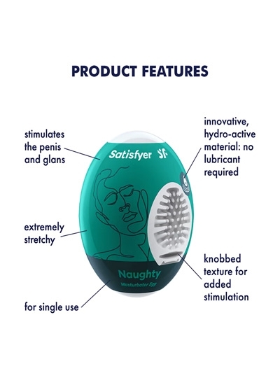 You’re always on the safe side with the Satisfyer Naughty Masturbator Egg. The masturbation device is intended for single use: The design is egg-shaped, discreet and ideal for a quick fix on the go. The eggs are made from innovative, flexible, hydroactive TPE, which can be moistened with a small amount of water or saliva, ensuring smooth pleasure with a smooth feel. Experience maximum enjoyment without additional lubricant.