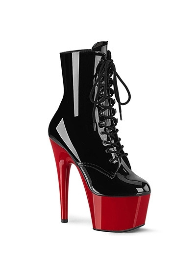 Pleaser 7" Stiletto Heel Lace-Up Platform Ankle Boot, Side Zip Black Patent/Red