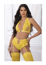 3pc High Waist Garter Laced Panty and Halter Top Set With Stockings - One Size