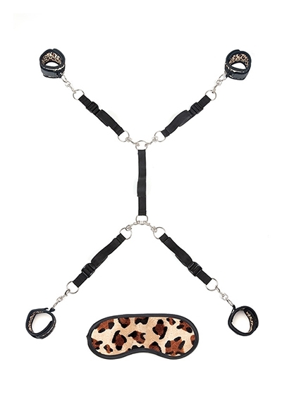 You no longer need a dungeon with this convenient 7-piece bondage set that easily allows you to turn your bed into the ultimate setting for intense BDSM play. The Lux Fetish 7-Piece Bedspreader in a fun leopard pattern is a must-have for every kind of restraint play enthusiast — whether you’re a hardcore bondage fan or a first-time kink explorer. The set includes four adjustable cuffs made of neoprene, tethers and four straps that connect to a center band that can be used on beds of all sizes. Each strap features a cuff attached to an O-ring with a swivel clip to keep a submissive partner comfortably and securely in a spread open position and ready for kinky fun. The set-up for this bed spreader kit is easy; and when playtime is over, you can discreetly tuck the cuffs away under the mattress until your next kinky session. Intensify the sensation of every touch by placing the included blindfolded over the eyes of the restrained partner.