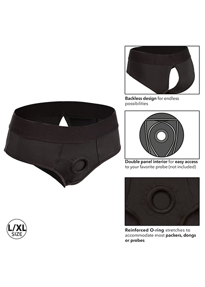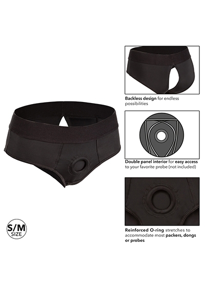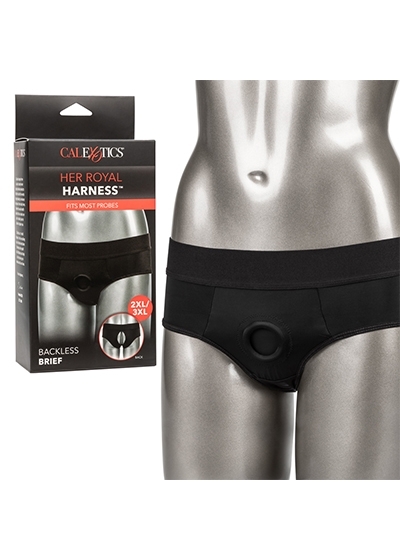 The Her Royal Harness Backless Brief is an ultra-comfortable harness fashioned like a risqué backless brief with powerful performance and comfort in mind. This bold harness has an extra-wide waistband, soft stretchy fabric and reinforced O ring for the ultimate support. The durable, reinforced O-ring stretches to accommodate your favorite probe, packer, vibrator or dildo. With a form-fitting design, this comfort harness can be worn discreetly under clothes. Enjoy pleasure made for two with the double panel interior for easy access to your favorite probe. Beginners and expert users alike will love frustration-free pleasure with this easy-to-wear harness. Simply secure your favorite probe, slip into the bold backless brief and dive deep into passionate penetration or enjoy comfortable all-day wear. Enjoy easy clean up by machine washing and hanging to dry.