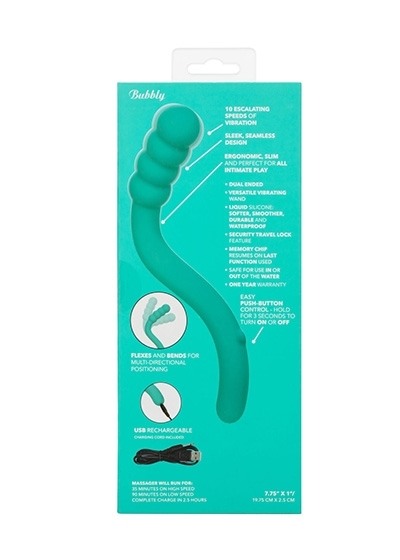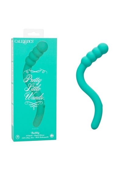 Indulge in your magical side and cast a spell for endless pleasure with the Pretty Little Wands Bubbly. Thrust yourself towards new heights of pleasure with the unique slim massager complete with 10 speeds of vibration, a multi-directional flexible body, and indulgent dual ended design. Sure to hit just the right place, the flexible massager has multi-directional positioning to flex and bend into the perfect position. Get lost in pleasure alone or with a partner with the indulgent dual ended design. Up the intensity with 10 incremental speeds of vibration pulsating throughout the slim massager. While the easy-touch button controls the intensity and the vibe gives you the stimulation you want, the pliable body holds any position you desire. Recharge the premium silicone teaser in 2.5 hours with the provided USB charging cable to enjoy 35 minutes of high-speed stimulation or 90 minutes of low speed vibrations. The premium liquid silicone is made to be softer, smoother, and more durable than you've ever experienced before. A state of the art memory chip remembers just how you like it by resuming on the last function used when turning back on.