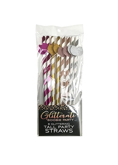 Designed for the Bride with impeccable taste, style and class, our 8-Inch Glitterati Straws will elevate your next Bachelorette or Anniversary party to VIP status. Our paper cocktail straws have a beautiful metallic stripe and a glittery boobie applique. Each pack of eight straws (gold, silver, rose gold and bronze) are on-trend for this wedding season. Complete the look with coordinating Glitterati boobie balloons, plates, napkins and more!