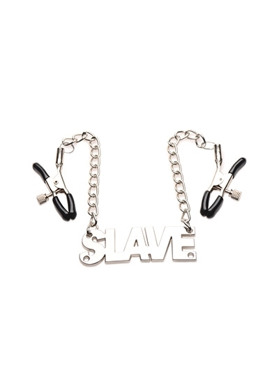 Make sure everyone knows their place when they wear these nipple clamps. The large, bold font spells out SLAVE and with a tug against the clamps you can put them in their place if they forget! The nickel free metal is perfect for sensitive skin and the shining metal looks great as a kinky accessory!