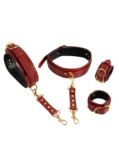 Handcuffs and thigh restraints from Bad Kitty made out of beautiful red imitation leather with gold-coloured metal details. The slightly padded, adjustable straps for the thighs and wrists can be joined together by removable straps with snap hooks. 1 pair.