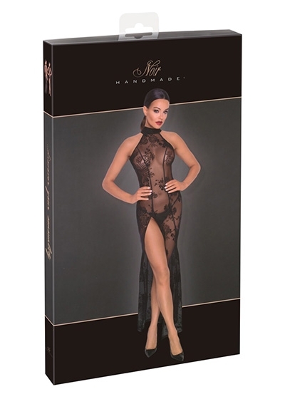 Ärmelloses, langes Kleid von Noir komplett aus elastischem Powernet mit feinem Samtflockprint im Blütendesign. In enger Schnittführung mit extra hohem Beinschlitz vorne seitlich. Der Stehkragen wird im Nacken über dem tiefen ovalen Rückenausschnitt mit einem kleinen Knopf geschlossen.