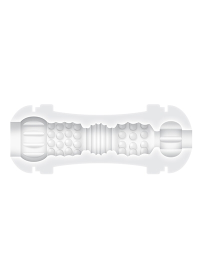 Allow the pleasure possibilities to unfold with this unique dual-ended stroker that’s beautifully transparent for an erotic see-through experience. Two separate entries with varying sizes (one tight, one loose) lets you choose your adventure inside the circular beaded chamber that’s soft and squishy, yielding yet firm. An included vibrating ring lets you experiment with intense stimulation while you play! The hard plastic exterior canister is textured for an easy grip while caps at both ends ensure safe storage and protection. Sleeve pops out for cleaning.