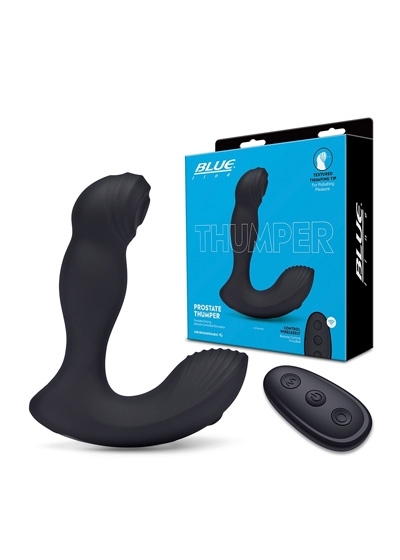 Tap into tantalizing titillation with the Thumper Prostate Massager from Blue Line. Provide simultaneous stimulation to your prostate and perianal area with independent motors that tap and vibrate all more most pleasurable points, or take your body on an adventure of full-body orgasms with dual motor strength vibrations. Give your sphincter the massage of a lifetime with a 4.5 hooded shaft and ridged texture made with 100% body-safe silicone for navigating the sphincter with pleasure. With Independently controlled tip-tapping and base vibrations, stimulate your stern as fast or slow as you'd like with 3 vibration intensities and 4 vibration patterns. Remote control capabilities lets you harness your pleasure hands-free, or grant control to your partner for a stimulating session of surprises. The 100% silicone body and splashproof charge port makes the Thumper safe to use with any water-based lube and super easy to clean with soap and water so you only need to worry about your pleasure.