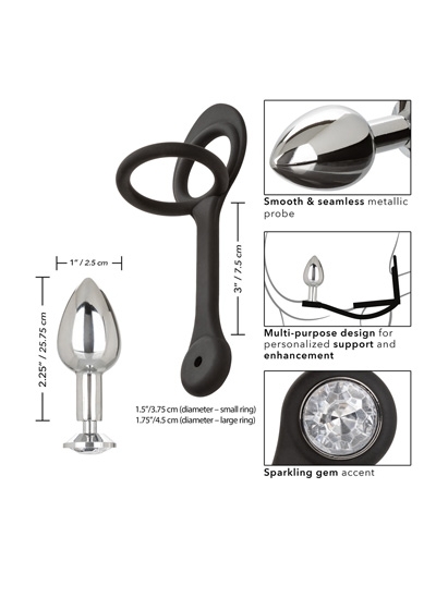 Blast off to a universe of personalized pleasure with the Star Fucker Mini Plug. A stretchy, silicone dual enhancer is paired with a sleek, seamless metal probe for versatile support, enhancement, and even tantalizing temperature play. The supple silicone dual enhancer was created to increase stamina, improve sensitivity and deliver superior erection support. Get playful by using the dual enhancer and metallic probe together, and don't forget they can be disassembled for easy cleaning. The flexible probe is made from a smooth, seamless aluminum alloy that retains heat or cold for a one-of-a-kind temperature play experience. While you expand your horizons with the sleek mini plug, use the sparkling gem adorned base for steamy stimulation, effortless insertion and gentle removal. The view gets even better from behind with the sparkling gem base.